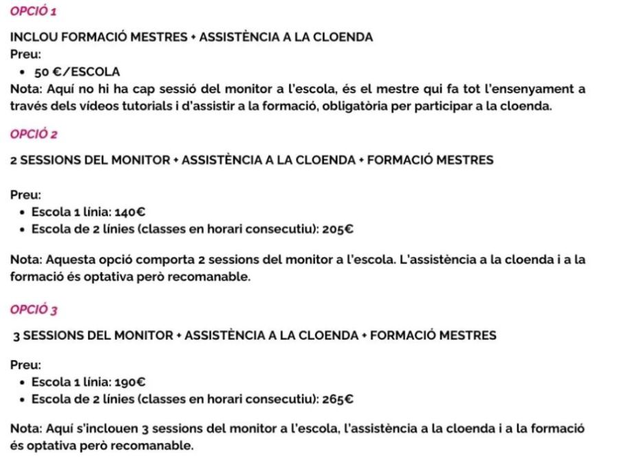 L’escola ha de triar quin curs hi participa i alhora, en quina modalitat (opció 1, 2 o 3) prefereix fer-ho. Inscripcions obertes fins al 21 de novembre de 2025. El preu de la campanya és el següent només en cas de voler alguna de les modalitats següents: